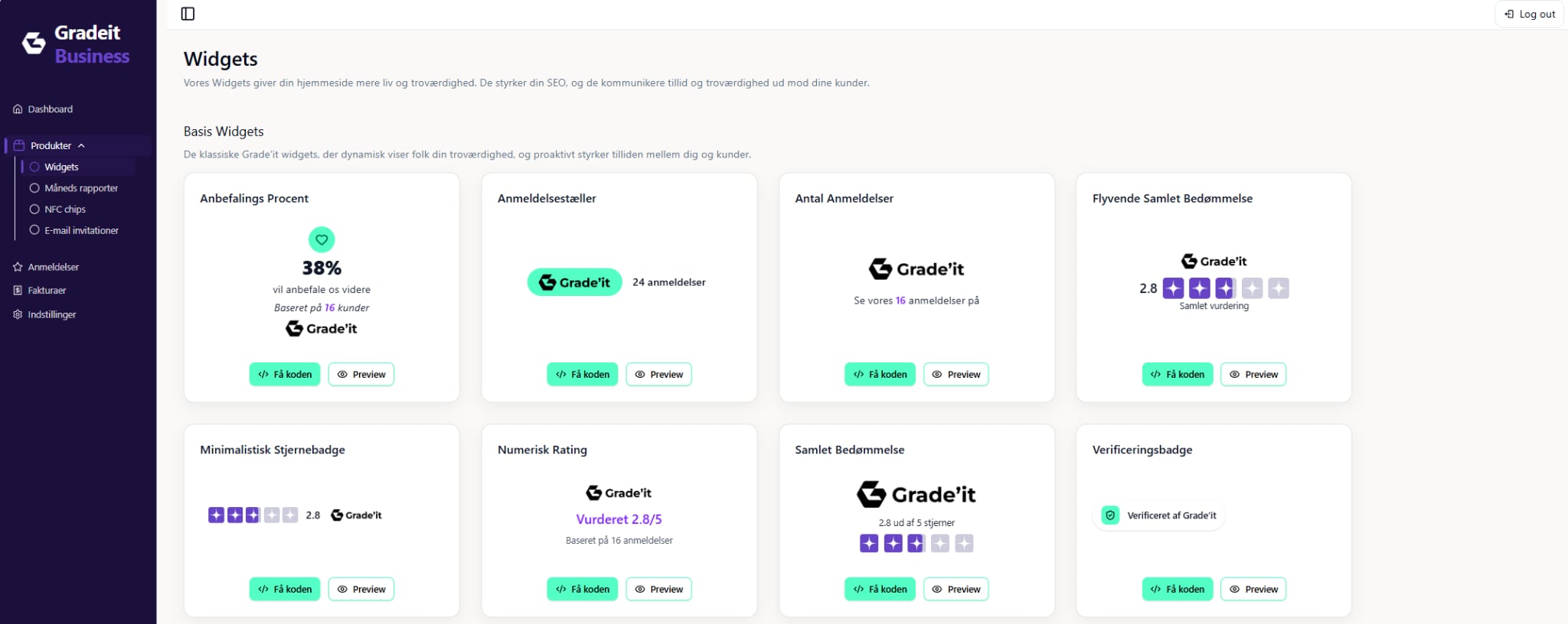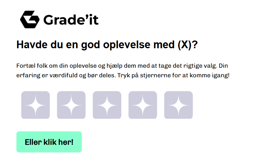 Tag kontrol over dit omdømme med Grade'it. Vi gør det enkelt at indsamle feedback, fremvise dine bedste anmeldelser og handle på det, kunderne ønsker (til en pris alle kan være med på).