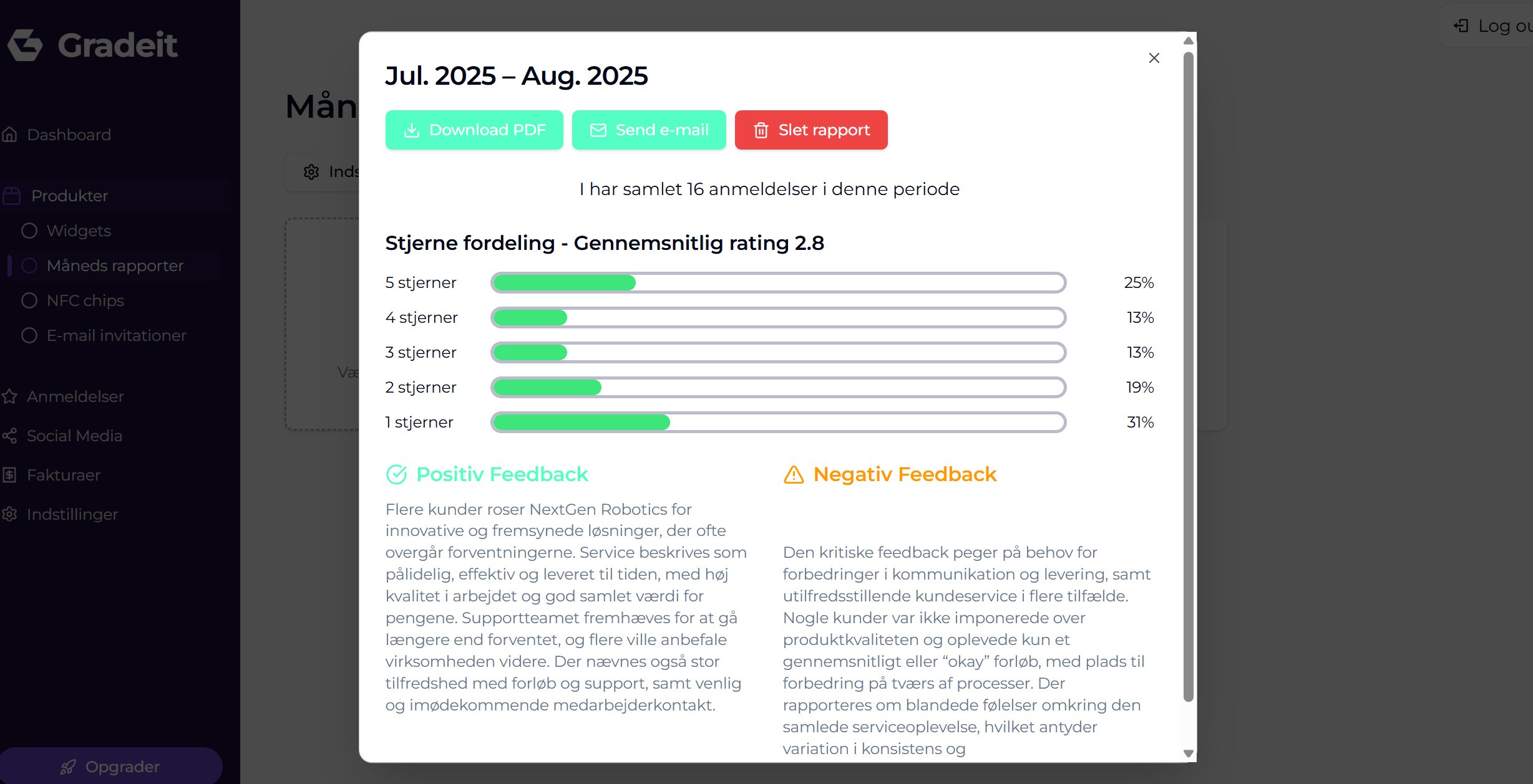 Med vores automatiske rapporteringssystem får du månedlige indsigter i dine anmeldelser uden at skulle løfte en finger. Få værdifuld feedback fra dine kunder og brug den til at forbedre din virksomhed.